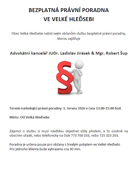 Obec Velká Hleďsebe nabízí svým občanům službu bezplatné právní poradny, kterou zajišťuje Advokátní kancelář JUDr. Ladislav Jirásek & Mgr. Robert Šup.